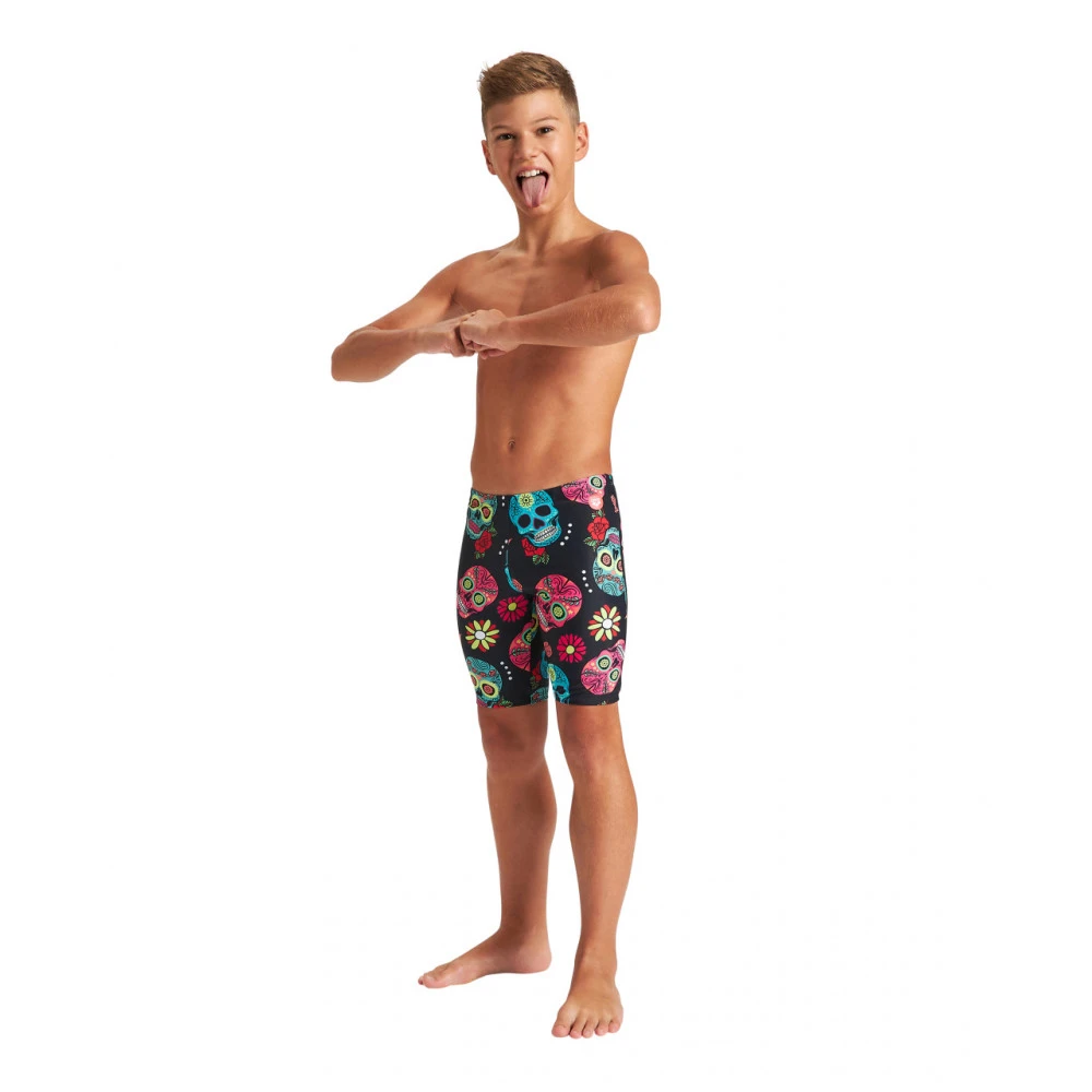 Ce jammer Junior de chez Arena reprend le thème adulte Crazy Skulls Carnival.